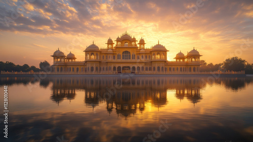 Fototapeta premium stunning sunrise view of ornate palace mirrored in calm lake, surrounded by...