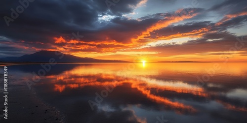 © Gular, Obraz premium Stunning sunrise with volcanic clouds reflecting light, creating a beautiful sunrise scene on a northern shore, evoking the beauty of nature during this breathtaking sunrise moment.