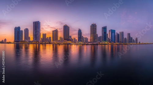 © harryaishi, Fototapeta premium Stunning sunset cityscape reflected in calm water.