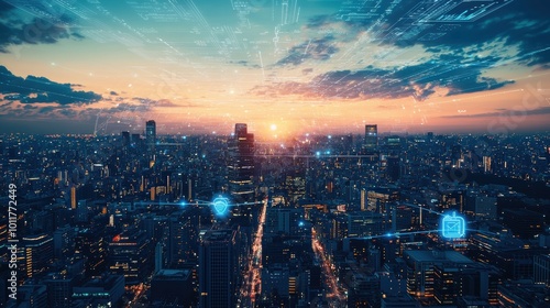 Obraz premium Stunning Sunset Cityscape with Towering Skyscrapers and Glowing Illuminations