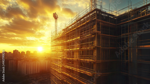© Thanthara, Obraz premium stunning sunset illuminates construction site with scaffolding, showcasing urban development