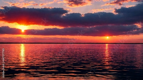 Obraz premium Stunning sunset on the lake, purple sky.