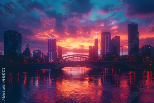© Cris, Fototapeta premium Stunning Sunset Over a City Skyline Reflected in Water