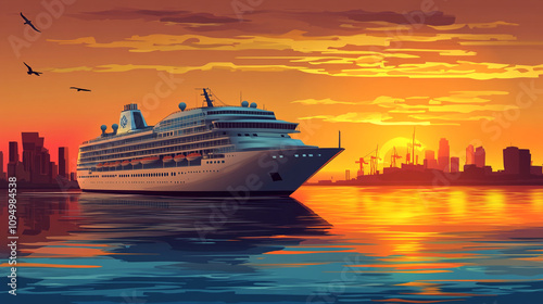 © Tahsin, Fototapeta premium Stunning sunset over a large cruise ship in a bustling city harbor