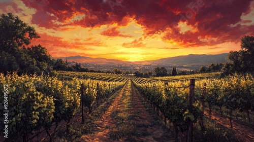 Fototapeta premium Stunning sunset over a peaceful vineyard, with the sky painted in warm hues...