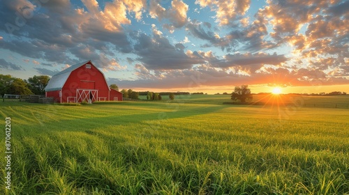 Obraz premium Stunning sunset over a red barn in a lush green field, with a dramatic sky...