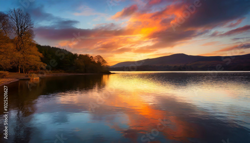 Fototapeta premium Stunning sunset over a tranquil lake surrounded by trees and mountains in late afternoon light