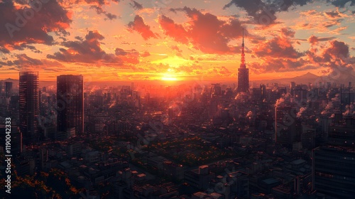 © QITIAN, Fototapeta premium Stunning sunset over a vibrant city skyline with towering structures and clouds.