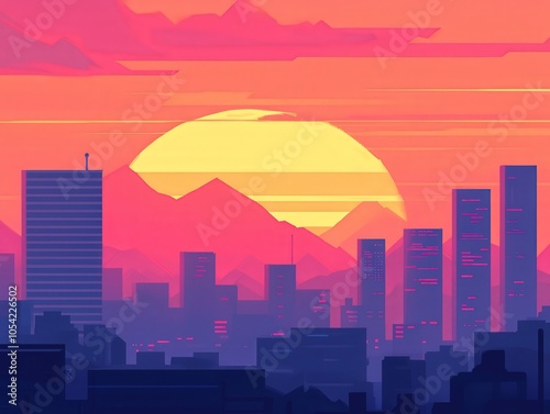 Naklejka premium Stunning Sunset Over a Vibrant Cityscape with Mountains in the Background