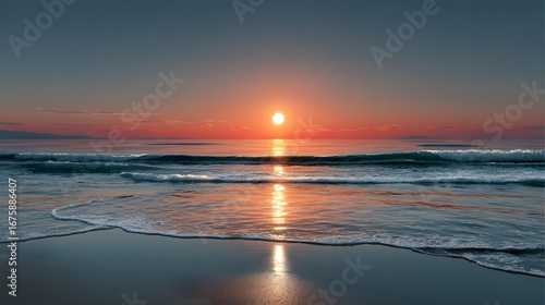 © OnuTH, Fototapeta premium Stunning Sunset Over Calm Ocean Waters with Reflective Shores and Soft Clouds in the Sky