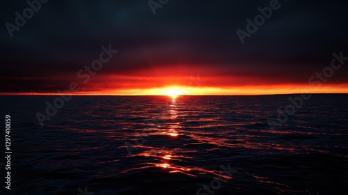 Naklejka premium Stunning sunset over calm ocean waters with vibrant colors reflecting on the...