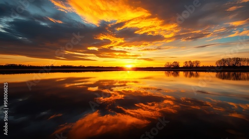 Naklejka premium Stunning sunset over calm water, showcasing vibrant orange and blue hues reflected in the serene landscape.