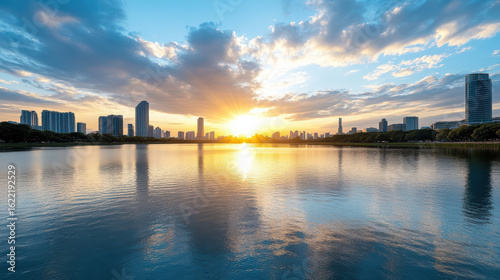 Naklejka premium Stunning sunset over city skyline reflecting on calm water, creating serene atmosphere