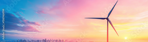 © Enjoy, Naklejka premium stunning sunset over city skyline with wind turbine in foreground, showcasing renewable energy and vibrant sky filled with pink and blue hues