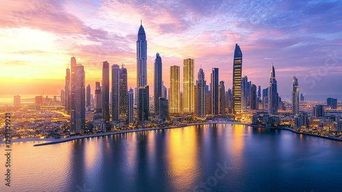 © Tuachan, Obraz premium Stunning Sunset Over Dubai Skyline with Reflective Water Views