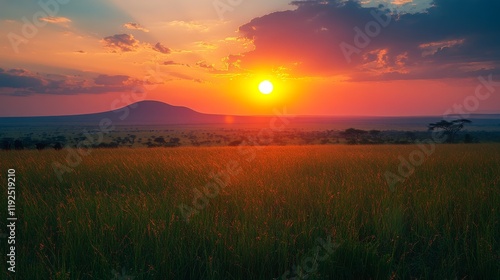 Fototapeta premium Stunning sunset over endless grasslands with vibrant colors in the sky