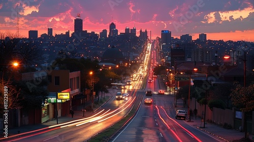 © AS Photo Family, Obraz premium Stunning Sunset Over Johannesburg: Urban Landscape with City Lights and Long Exposure Traffic Trails
