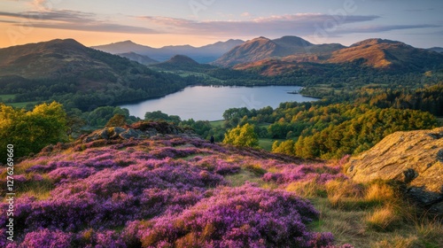 © Chayanin Wongpracha, Fototapeta premium stunning sunset over lake and mountains in the uk