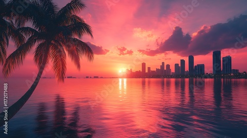 Obraz premium Stunning sunset over miami skyline cityscape tranquil waters