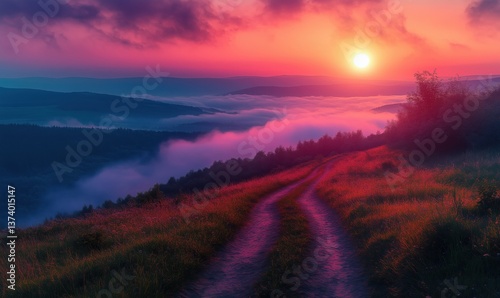 © Vergiliy, Fototapeta premium Stunning sunset over misty valley with winding path and vibrant colors