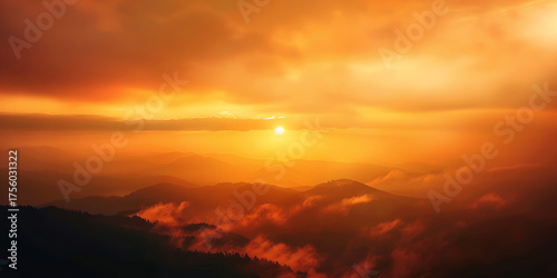 © Zia, Obraz premium Stunning sunset over mountain range with clouds