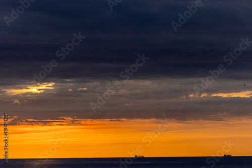 Obraz premium Stunning sunset over ocean, dramatic clouds, silhouetted ships on horizon, creating serene, majestic scene