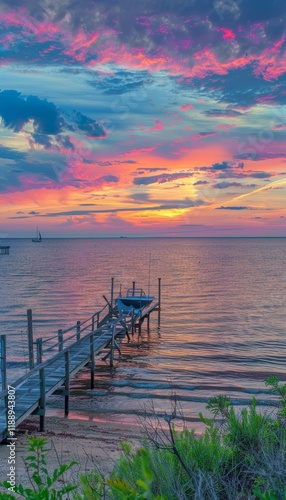 © decorator, Obraz premium Stunning sunset over ocean with charming dock and boat, embracing tranquility and romance