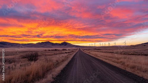 Naklejka premium Stunning Sunset Over Open Road with Wind Turbines on Horizon