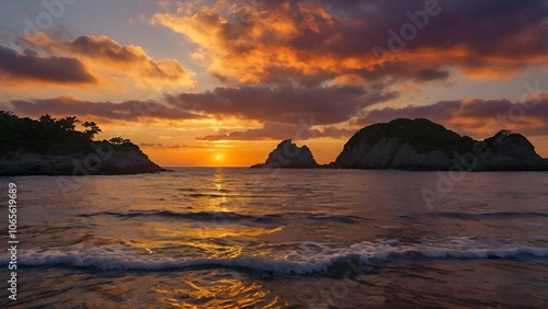 Fototapeta premium Stunning Sunset Over Rocky Seascape with Dramatic Clouds