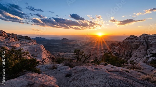 Obraz premium Stunning sunset over rugged mountain landscape with vibrant sky and distant...