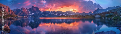 Fototapeta premium Stunning Sunset Over Serene Mountain Lake with Dramatic Sky and Reflections...