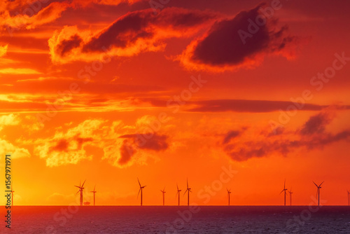 © elena_suvorova, Fototapeta premium Stunning sunset over the sea near Denmark, captured from a cruise ship. Wind turbines silhouette the horizon under vibrant red and orange skies.
