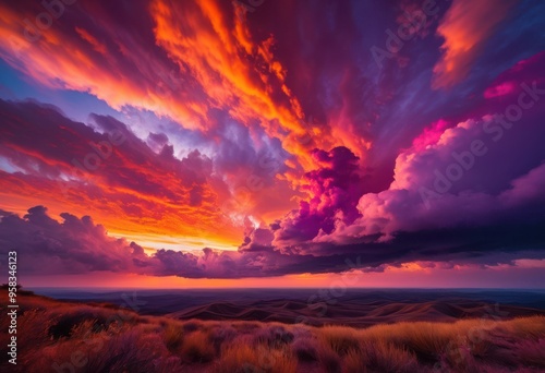 © Yaroslava, Fototapeta premium stunning sunset over vibrant cloud formations rich colors dynamic patterns sky, view, breathtaking, horizon, nature, scenery, beauty, landscape, light