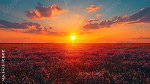 Fototapeta premium Stunning Sunset Over Vibrant Flower Field with Warm Colors and Dramatic...