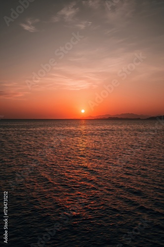 Naklejka premium Stunning sunset paints the ocean with fiery orange hues reflecting on calm...