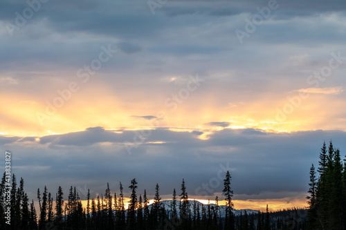 Fototapeta premium Stunning sunset rays shining bright along the Alaska Highway during...