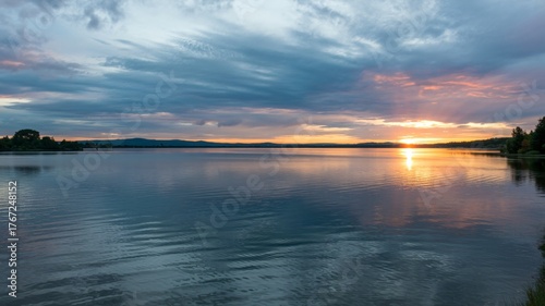Naklejka premium Stunning sunset reflecting on tranquil lake water surface