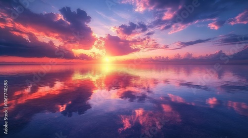 Fototapeta premium Stunning Sunset Reflection in Calm Water with Dramatic Cloudscape -...