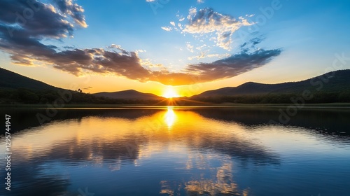 Fototapeta premium Stunning Sunset Reflection Over Calm Lake Surrounded by Mountains and Sky :...