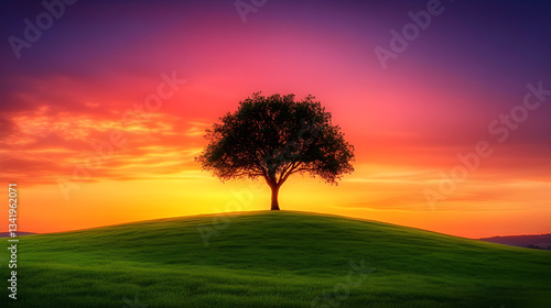 © Hettie, Obraz premium Stunning Sunset Silhouette: A Serene Landscape with Vibrant Sky and Lonely Tree