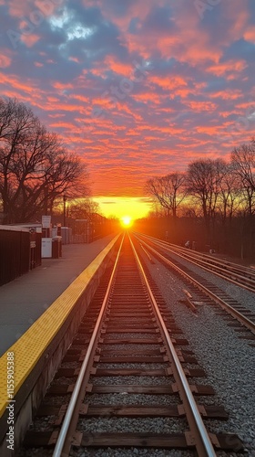 Fototapeta premium Stunning sunset view at a quiet railway station with tracks leading into the...