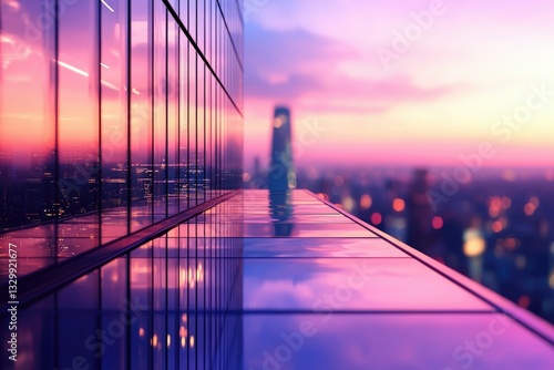 © iv, Obraz premium Stunning sunset view from a skyscraper's rooftop, reflecting city lights and vibrant sky.