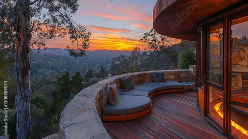 © Arsira, Fototapeta premium Stunning Sunset View from Modern Deck with Curved Stone Bench and Fire Pit