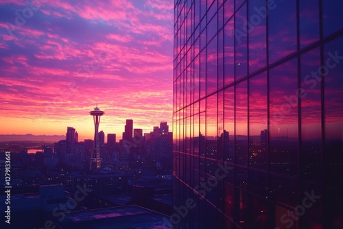 Fototapeta premium Stunning sunset view reflecting on modern glass skyscrapers in a city skyline