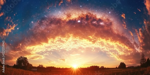 © Konstiantyn Zapylaie, Obraz premium Stunning sunset with glowing clouds and starry sky over tranquil landscape