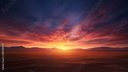 © tinnakorn, Fototapeta premium Stunning sunset with vibrant colors and a dramatic sky over an expansive desert landscape, symbolizing tranquility and natural beauty.