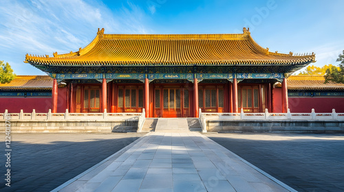 © Generative AI, Fototapeta premium Stunning Symmetrical View of Traditional Asian Temple Under Blue Sky : Generative AI