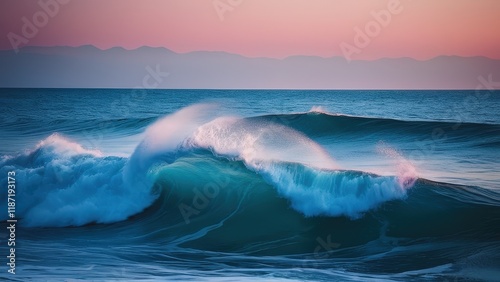 © Robert, Fototapeta premium Stunning teal wave crashing on the beach at sunset. Pink and purple sky, tranquil ocean scene. Perfect for travel, nature, and serenity themes