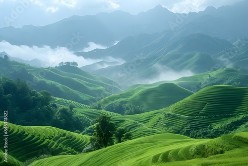 © D, Fototapeta premium Stunning Terraced Rice Fields in Misty Mountain Landscape for Nature, Travel, and Print