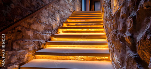 Fototapeta premium Stunning textured staircase with warm lighting and rustic wall design